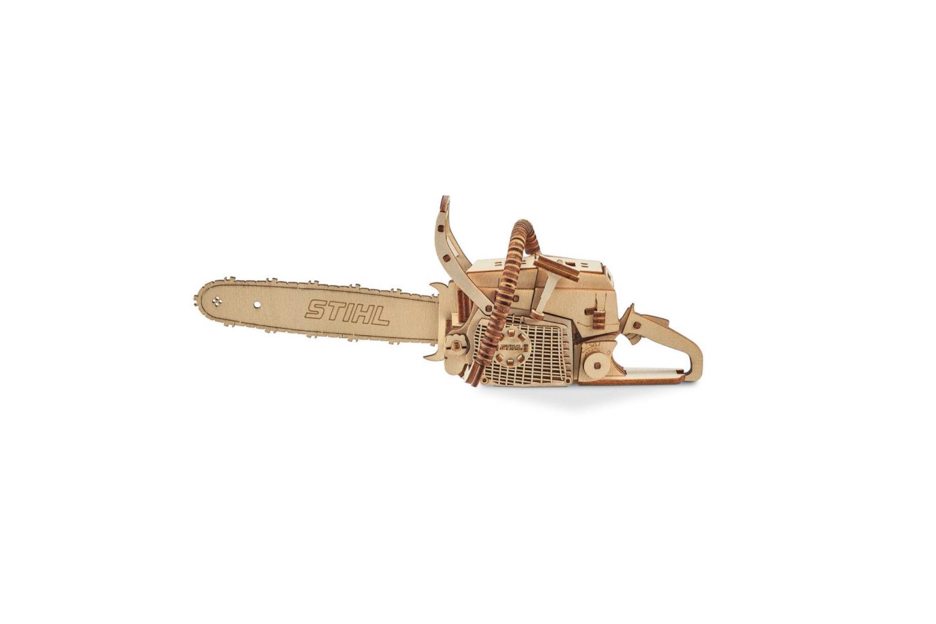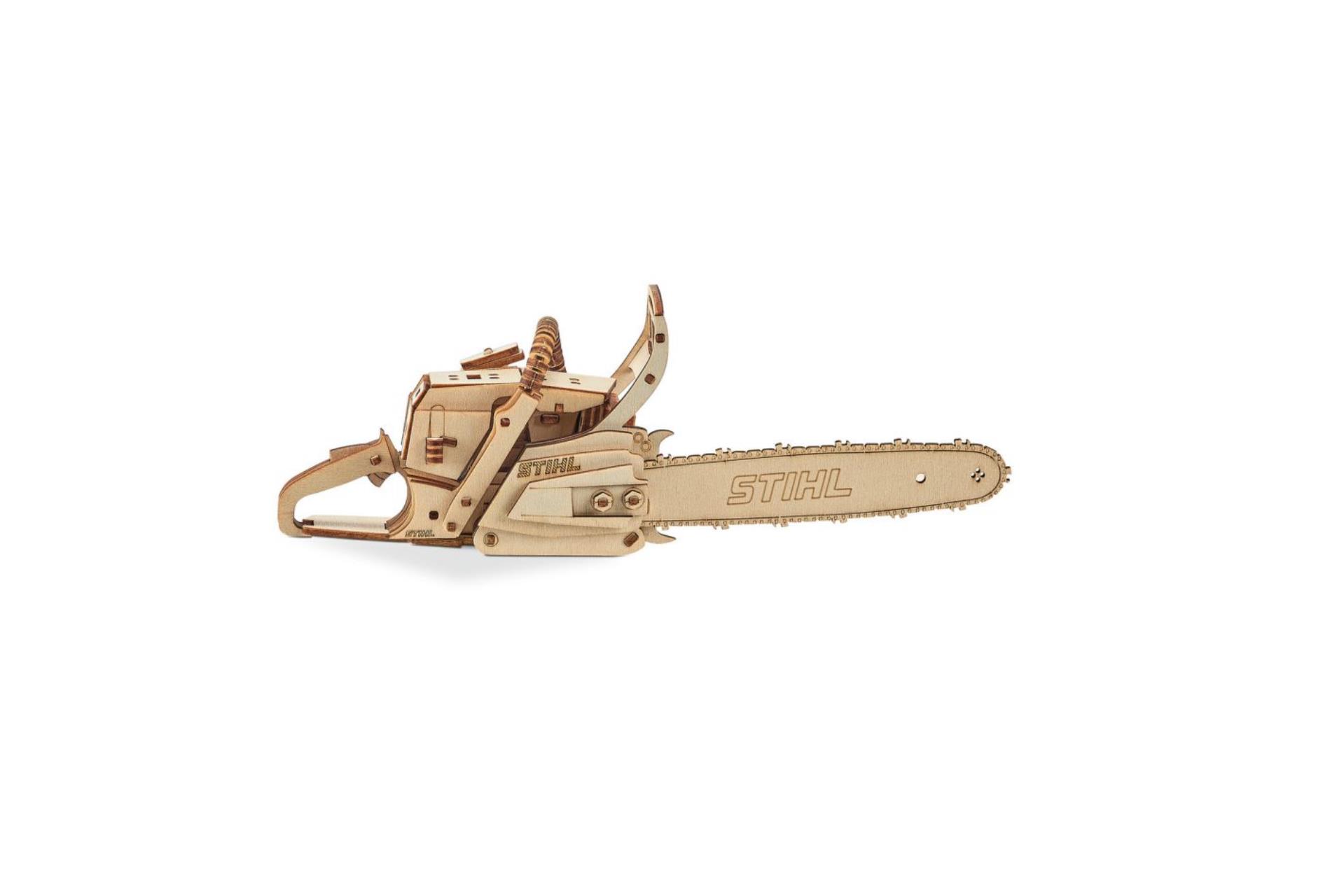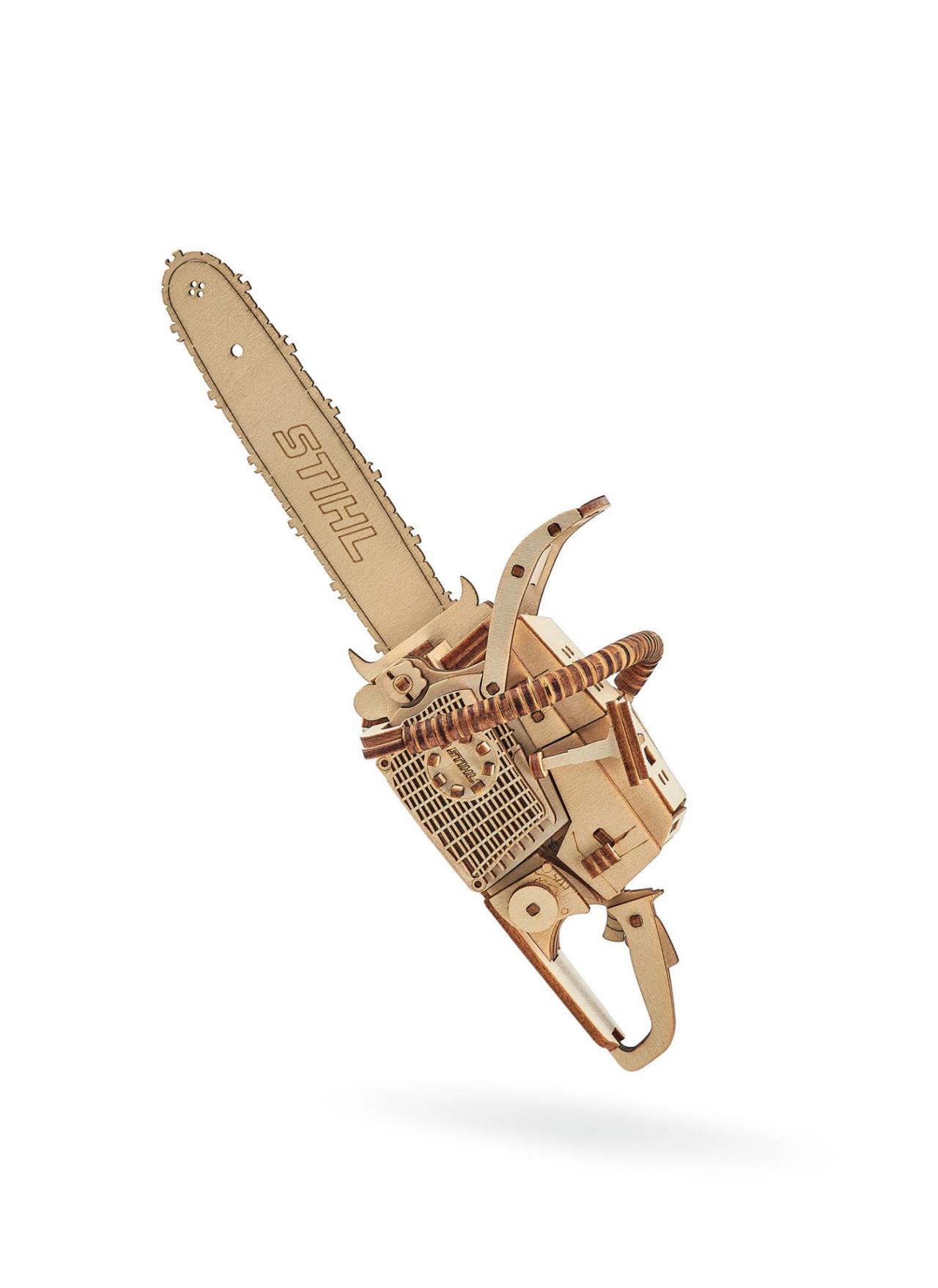 Bastle Dir Deine Motorsäge! Unser Motorsägen-3D-Holzpuzzle besteht aus 136 Teilen und hat eine Gesamtgröße von ca. 25 x 7 x 9 cm und besteht aus FSC zertifiziertem Holz.