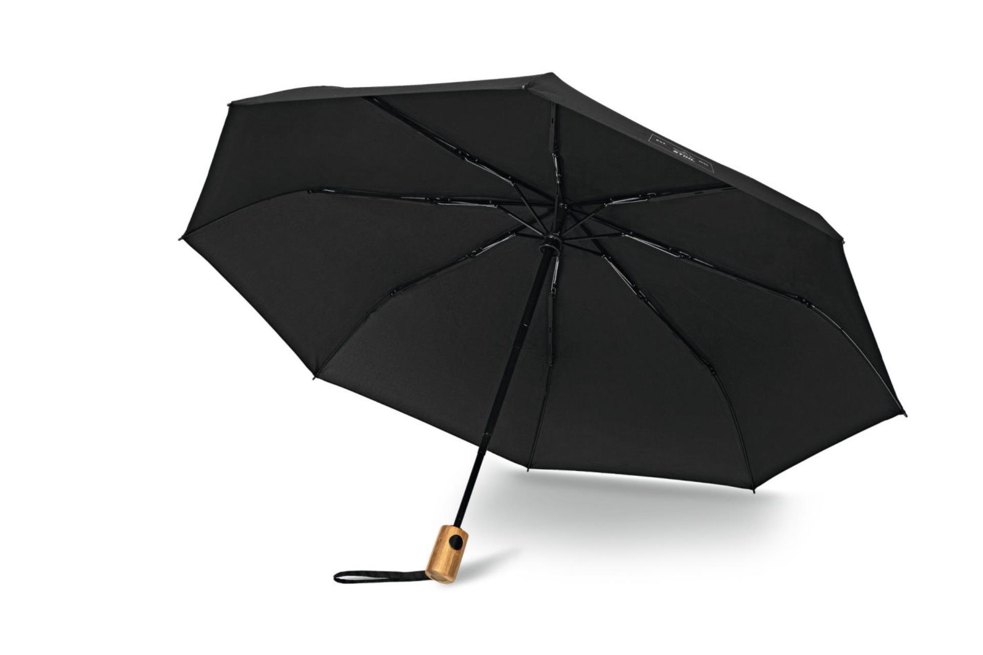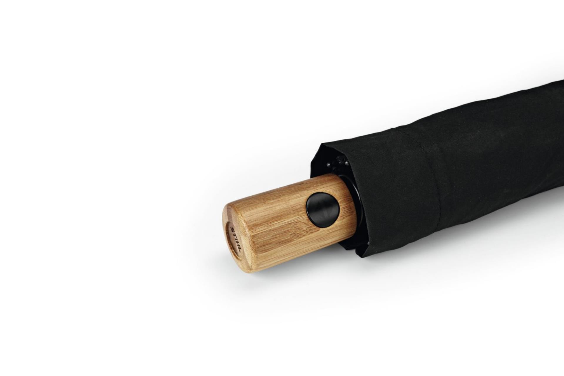 "Klein, aber oho"– so könnte man unseren Wegbegleiter beschreiben. Der handliche Taschenschirm mit einem Bambusgriff und Metallspitzen öffnet und schließt automatisch. Der Bezug ist aus 100 % Polyester-Pongee (recycelter Kunststoff gemäß STANDARD 100 by OEKO-TEX®). Kleiner, reflektierender STIHL Motorsägen-Print in Silber auf jedem zweitenn Segment. Schirm-Durchmesser: ca. 98 cm.
